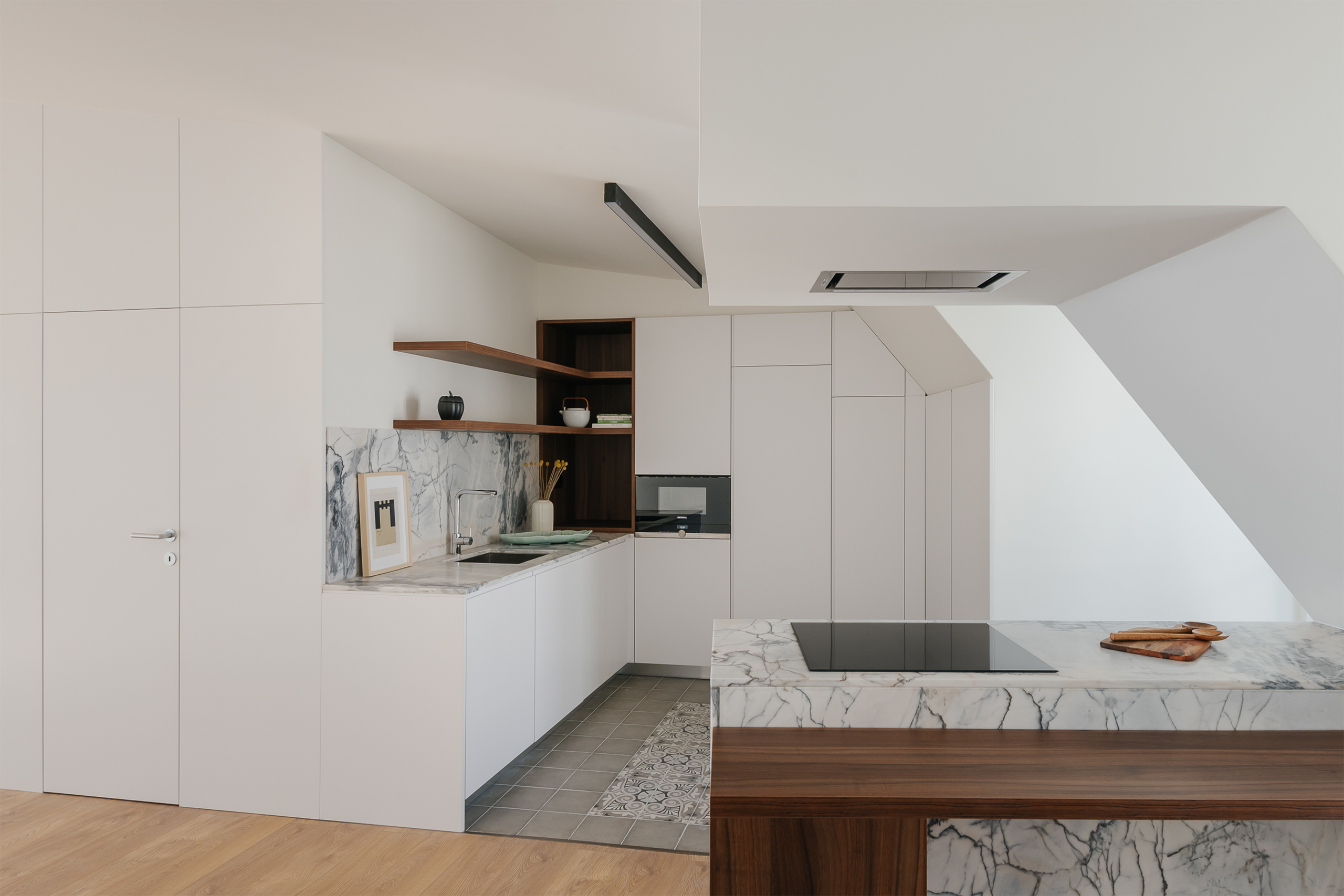 Located in the heart of Lisbon, this renovation project stems from the desire to have an apartment close to the rest of the family, and is a complete renovation and extension of a building. The resulting intervention is, however, a relatively anonymous gesture, in a desire to belong to the place, the neighborhood and the city. From the point of view of the city’s morphology, the building appears to be upside down. To the north, the main façade is connected to the narrow street in a city-neighborhood environment. To the rear, on the south façade, the connection is established with the Tagus River and with one of Lisbon’s most emblematic slopes, now transformed by its large-scale buildings. The difference in scale and experiences between the main and rear façades thus stands out, and is identified as a unique aspect for the development of the project. This duality is brought to the interior in a logic of inverse living.