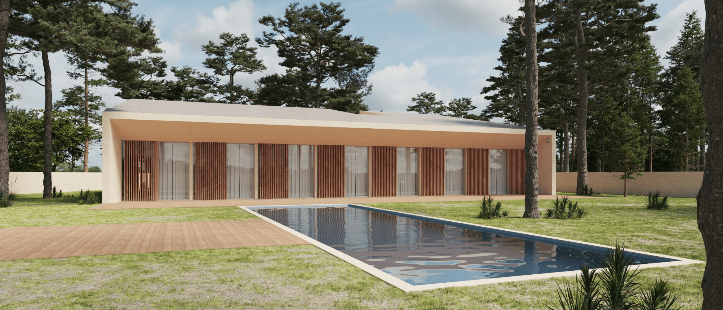 The house, while contained in its floor plan geometry, is volumetrically deconstructed. The structure presents varying heights depending on the perspective from which it is experienced. It reaches its full height at the main façade—the entrance of the plot—but gradually lowers toward the pool and outdoor social area, enhancing the sense of intimacy and comfort. The naturally sloping roof is visible and engages with the adjacent spaces. This volumetric deconstruction is also evident in the main façade, where the volume is carved out and split in two, reducing its visual impact while establishing a clear relationship with the existing pine trees on the site.